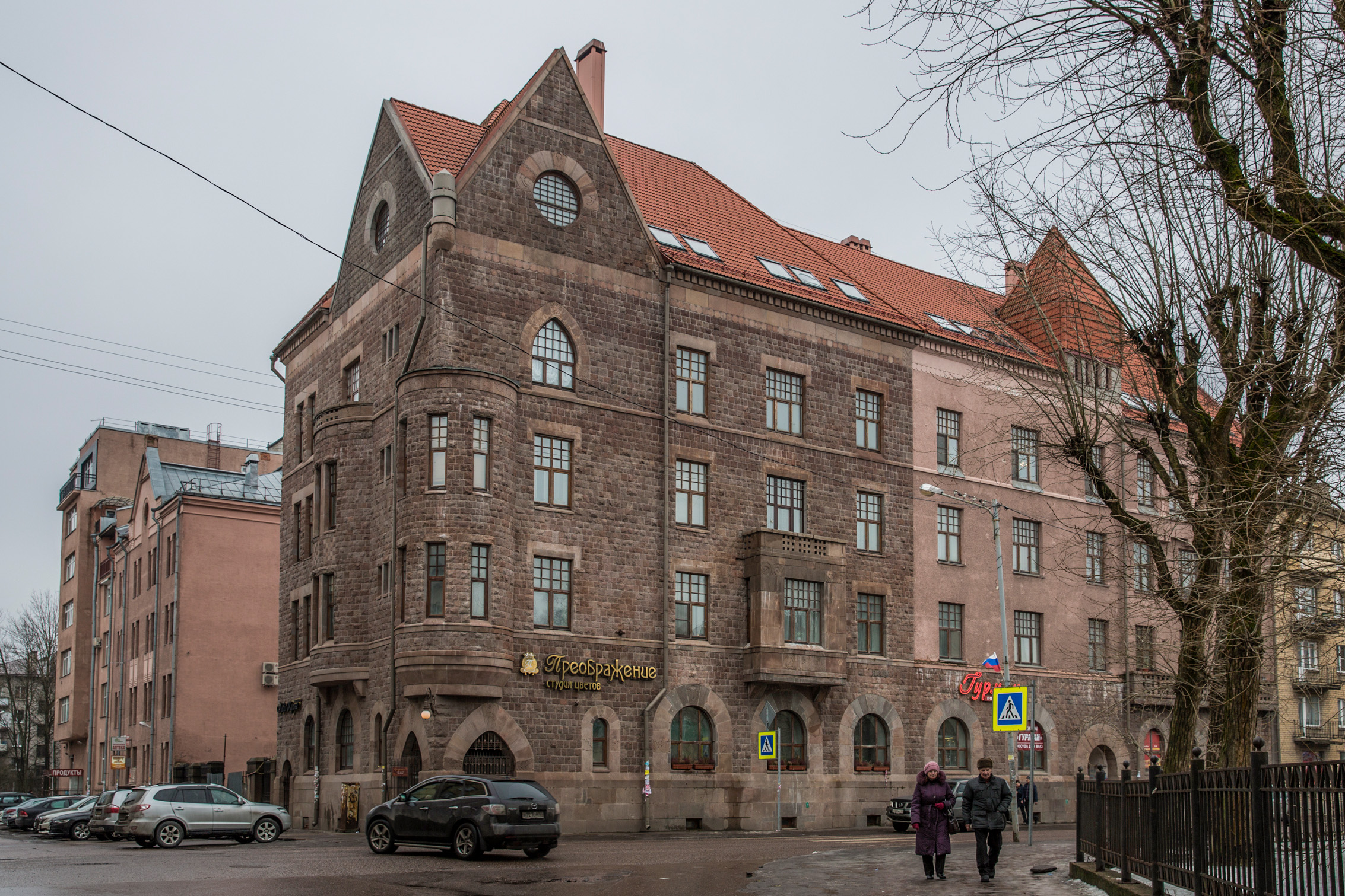 Прогуливаясь по Красной площади Выборга, обратите внимание на дом на Северной улице, 12, он же бывший дом общества Arina. Здание в стиле модерн, построенное в 1904 году по проекту Алана Шульмана, стало ярким положительным примером реставрации. Фасад привели в порядок за счет областного фонда капитального ремонта, а уже сами жители вместе с волонтерами расчистили в подъезде роспись с цветочным узором. Кроме того, в сотрудничестве с фондом «Внимание» они воссоздали парадную дверь в здание по историческим фото и чертежам.