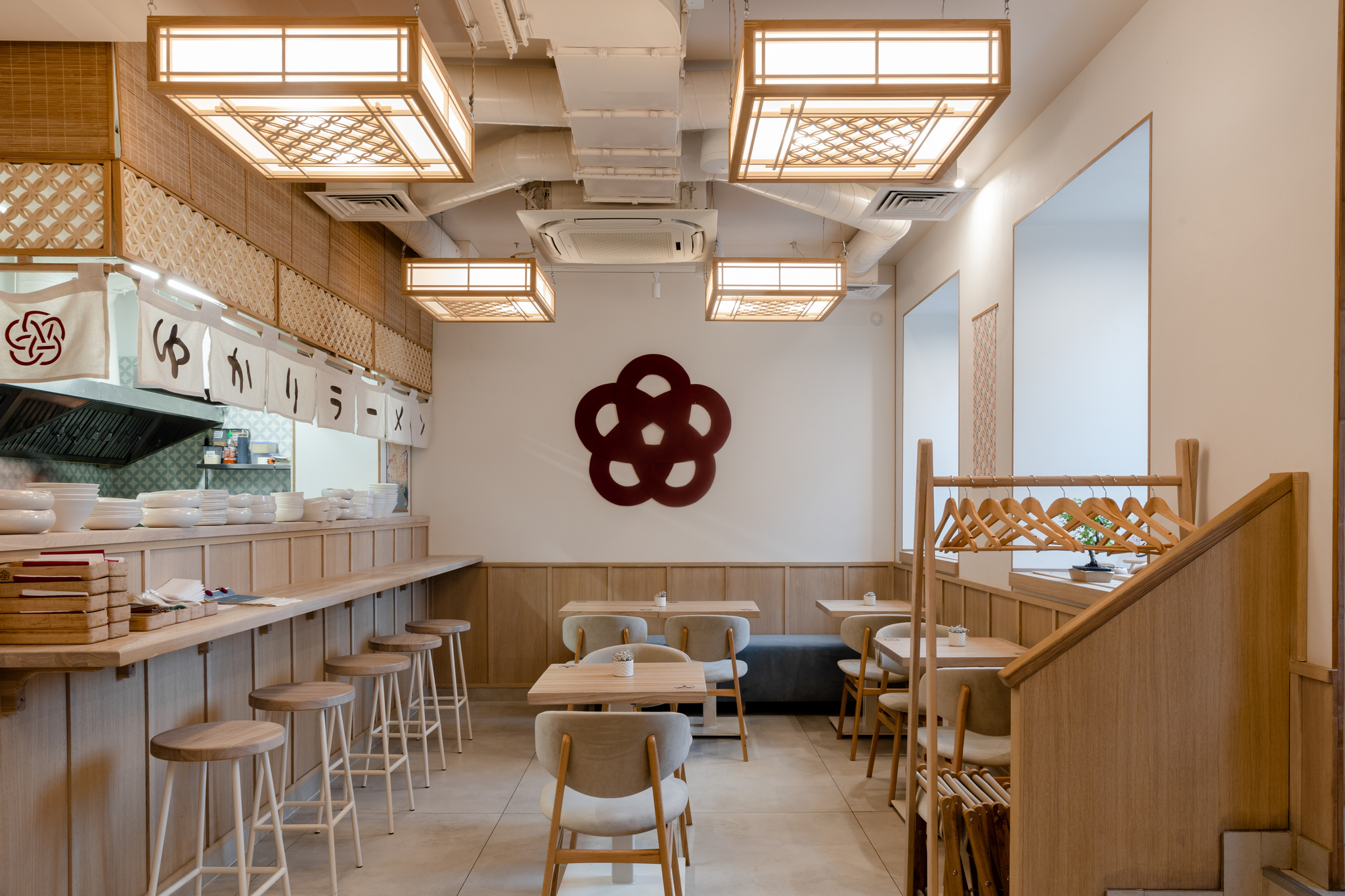 Интерьер заведения сделали максимально аутентичным. Светильники ручной работы выполнены в технике кумико, на стенах вывесили винтажное кимоно середины XX века и украшение казаримоно с изображением сливы, а на столах из светлого дерева выбили изображения камонов — японских семейных гербов.