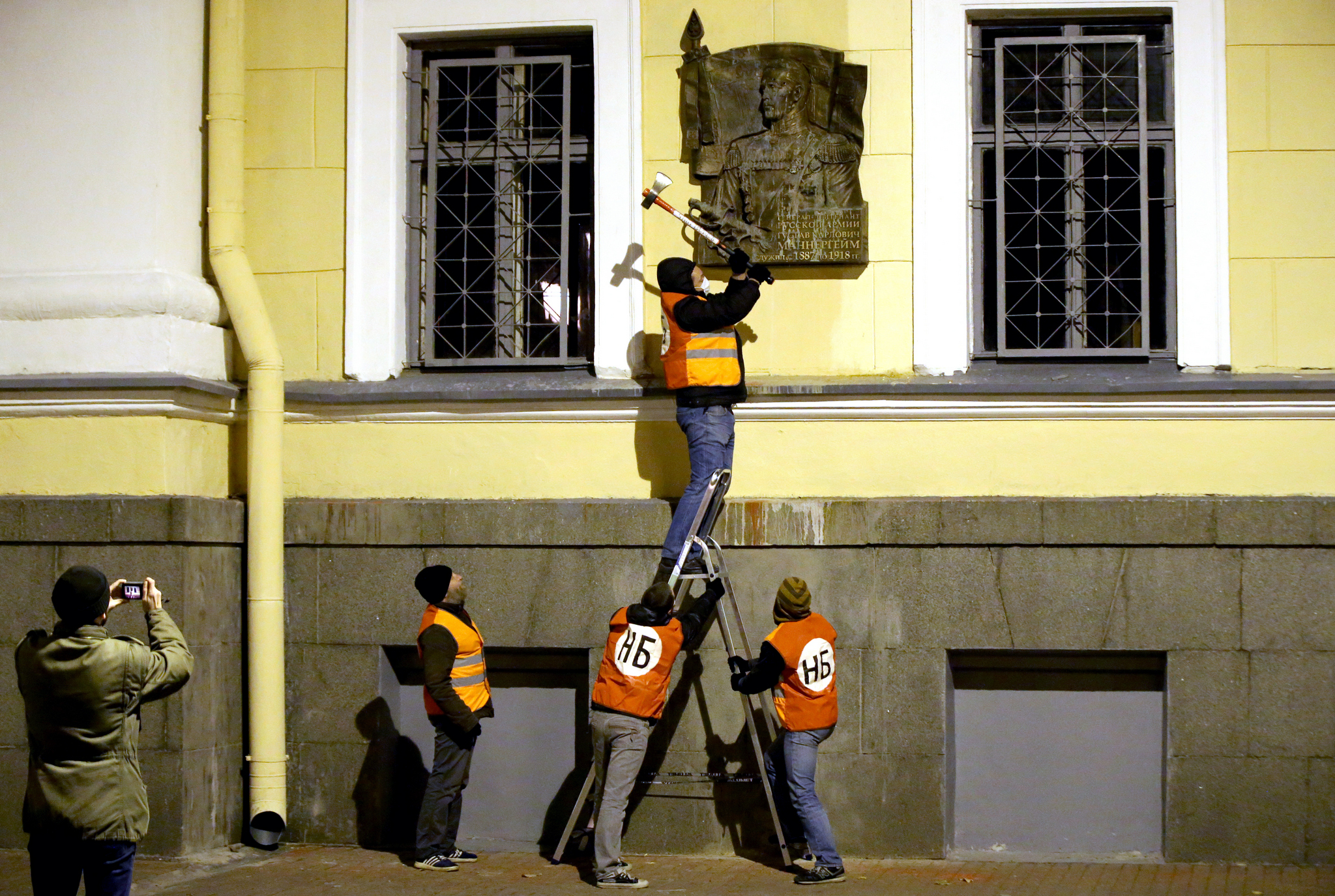 Активисты «Другой России» наносят удары топором по мемориальной доске Карлу Густаву Маннергейму на Захарьевской улице. Фото: Петр Ковалев / ТАСС