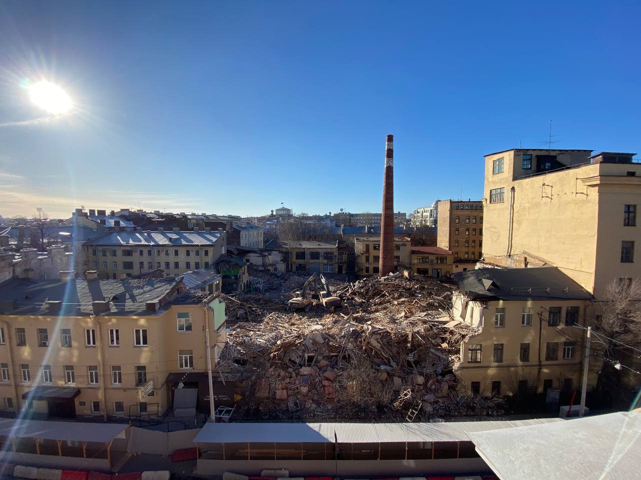 Компания «Прайд» 20 апреля продолжила сносить торговые бани Екимовой на Малом проспекте Петроградской стороны. Накануне демонтаж на время разбирательств запретил суд. Как сообщают градозащитники, подрядчики успели снести дореволюционный этаж здания.