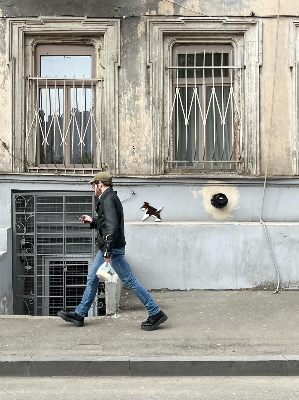 Здесь очень много уличных бродячих собак, и они, наравне с людьми, такие же полноценные жители этого города. Люди подкармливают их, заботятся, строят будки, делают прививки, гладят и чешут — и это нифига себе круто я скажу. [..] Ну и не мог я пройти мимо этой темы и не прикрепить стрит арт в честь грузинских собак», — пишет художник.